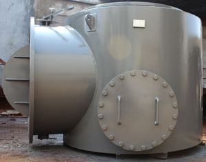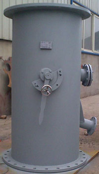 | 收球網(wǎng)是膠球清洗系統(tǒng)中的關(guān)鍵設(shè)備,它安裝于凝汽器出水管段上,攜帶海綿膠球的冷卻水,通過(guò)凝汽器管束,它的作用是把膠球從冷卻水中分離出來(lái),且必須具備不漏球、不卡球的性能,球被回收后由引出管從收球網(wǎng)引出打回裝球室。我廠(chǎng)生產(chǎn)的收球網(wǎng)是目前最先進(jìn)的結(jié)構(gòu)形式,它的柵網(wǎng)板可以轉(zhuǎn)動(dòng);在膠球裝置投運(yùn)時(shí),網(wǎng)板處于收球位置,在不投運(yùn)清洗裝置時(shí),該柵網(wǎng)板可以旋轉(zhuǎn)到與水流方向一致的位置;既減少水阻又起到清除柵板上雜物的作用。網(wǎng)板的轉(zhuǎn)動(dòng)定位由電動(dòng)執(zhí)行機(jī)構(gòu)執(zhí)行(小型收球網(wǎng)為手動(dòng)控制)。柵網(wǎng)板到位與否是保證收球網(wǎng)收球效率的關(guān)鍵之外。具體形式有SD(單網(wǎng)片)、 SF(A字分流式)、SLD(漏斗型)型。一、SD型收球網(wǎng)型號(hào):1、 結(jié)構(gòu)特點(diǎn) SD型收球網(wǎng)由一個(gè)網(wǎng)板、一個(gè)操作軸、導(dǎo)流翼、外殼、操作機(jī)構(gòu)(電動(dòng)執(zhí)行機(jī)構(gòu))等組成。網(wǎng)板由不銹鋼條制成,可以轉(zhuǎn)動(dòng),當(dāng)網(wǎng)板靠在外殼壁上時(shí)為收球位置,轉(zhuǎn)動(dòng)一定角度到達(dá)反洗位。2、 工作原理 ① 收球位置:當(dāng)系統(tǒng)運(yùn)行時(shí),網(wǎng)板處于收球位置,此時(shí)網(wǎng)板四周緊貼外殼內(nèi)壁,膠球通過(guò)網(wǎng)板阻攔在一側(cè)匯集,經(jīng)引出管,被一小股水流攜帶吸入膠球輸送泵,這樣,膠球又被送回裝球室進(jìn)行再循環(huán)使用?! 、?nbsp;反洗位置:網(wǎng)板前后壓差達(dá)一定值時(shí),操作網(wǎng)板至反洗位(收球后進(jìn)行),此時(shí)積存在網(wǎng)板上的雜物,就會(huì)被冷卻水流沖洗并攜帶走。3、 主要技術(shù)參數(shù) 收球率:≥95% 水 阻:≤300mmH2O 網(wǎng)板板條間距:7mm 電 源: 380V4、設(shè)備外形與結(jié)構(gòu)尺寸 |